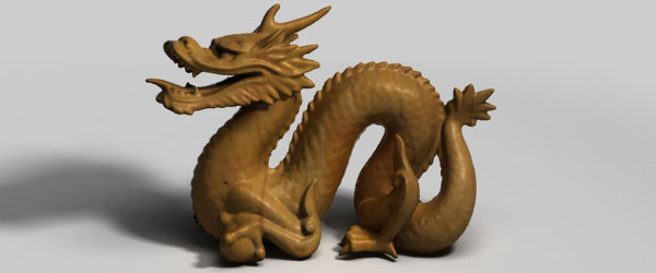 Let’s take a render of the mental ray Arch & Design material’s default configuration. For this tutorial, we’ll be using the Stanford Dragon Model scene. The grey material has some glossiness and specularity, but no special effects like blurring or transparency.