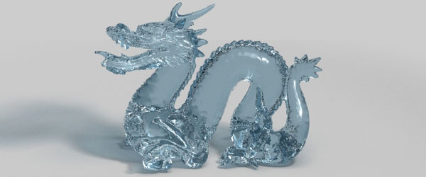 The physical glass material takes the longest to render, but yields excellent results. The difference with this material is that light is colored based on how long it travels inside of the object. Thus thick parts of the object below are colored with a deeper blue while thinner areas get less coloration.